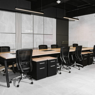 Cada área fue planificada con precisión: la sala de reuniones se diseñó para favorecer la claridad en la comunicación, con un mobiliario ergonómico y una mesa central equipada para trabajo colaborativo. Las estaciones operativas, con sus superficies amplias y divisores de vidrio, promueven concentración sin aislar al equipo. Finalmente, la oficina ejecutiva combina presencia y funcionalidad, integrando almacenaje a medida y una iluminación indirecta que realza la geometría del diseño.