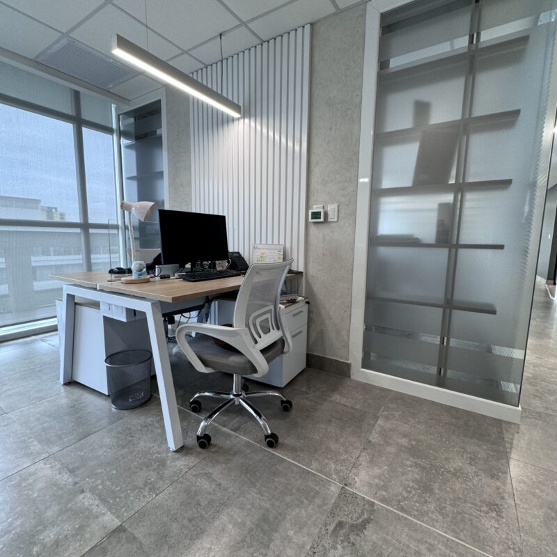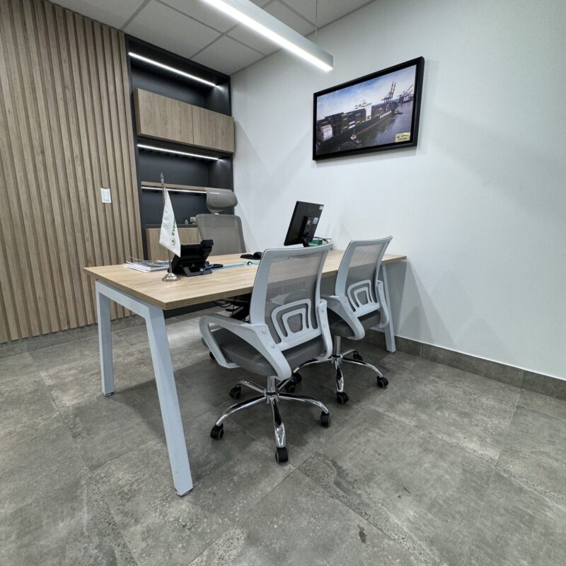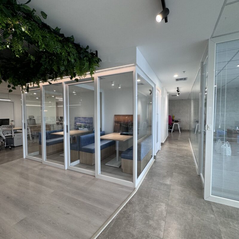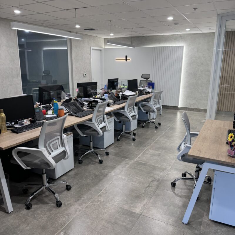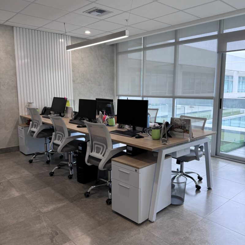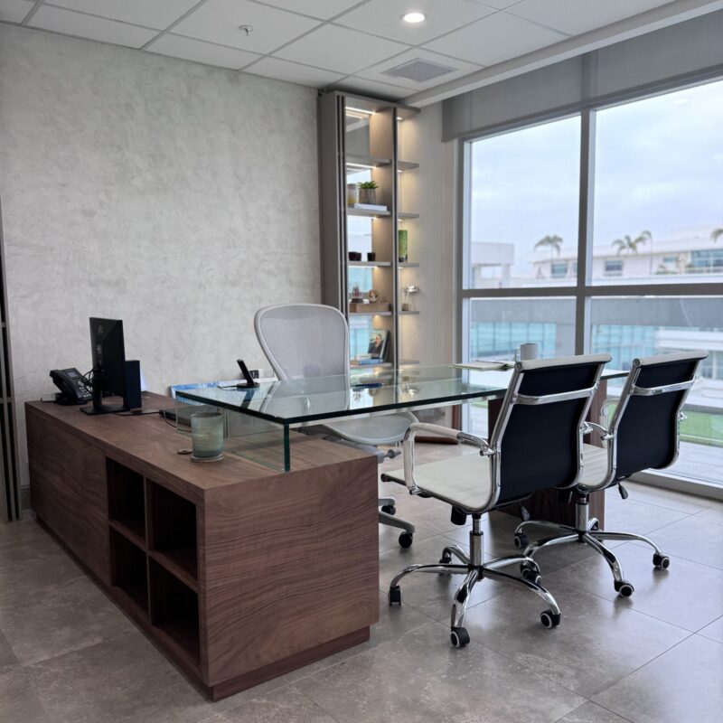 La oficina combina áreas abiertas de trabajo colaborativo con espacios privados y salas de reunión cerradas en vidrio, logrando un equilibrio entre concentración, comunicación y transparencia. El mobiliario ergonómico, la iluminación lineal suspendida y los detalles arquitectónicos —como paneles texturizados, madera natural y acentos verdes— refuerzan una atmósfera profesional, ordenada y moderna, pensada para el bienestar diario del equipo.