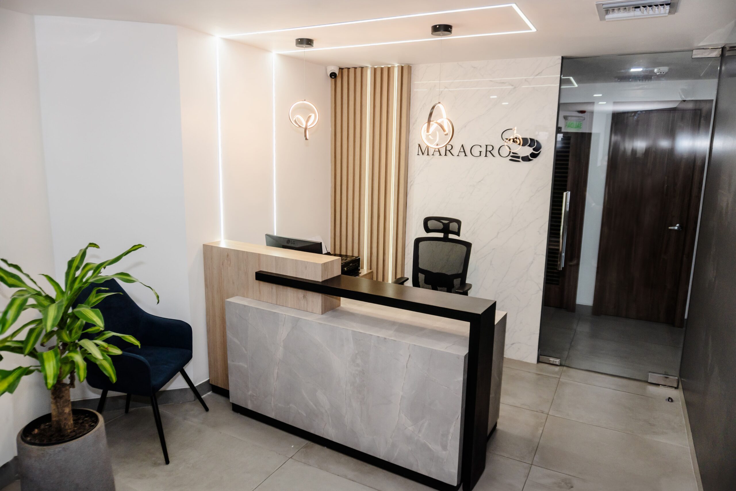 El diseño para las nuevas oficinas de Maragro nace de la necesidad de proyectar la jerarquía y solidez de una empresa líder en el sector acuícola. El reto fue crear una atmósfera que equilibrara la calidez de la madera con la elegancia atemporal de las texturas pétreas.