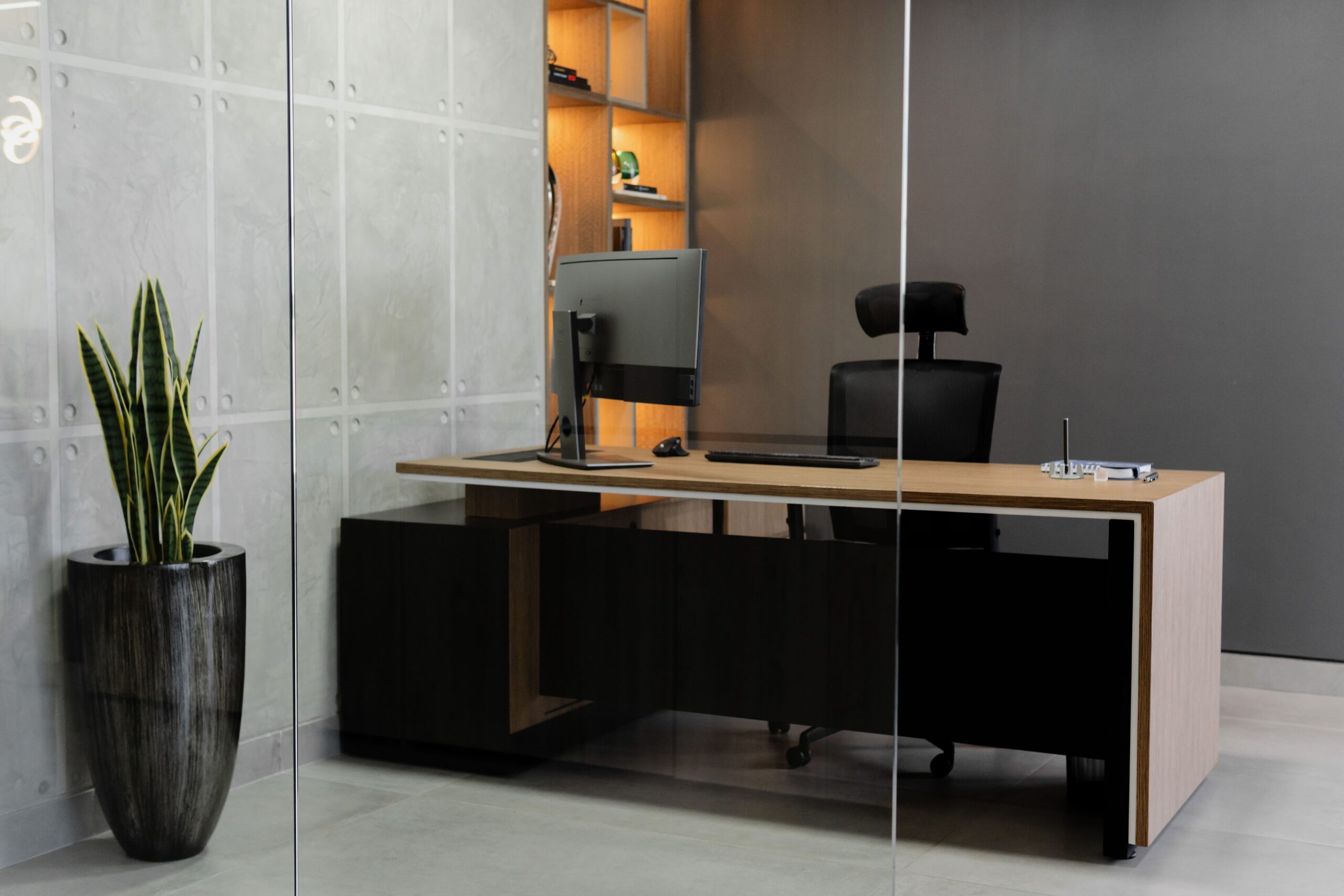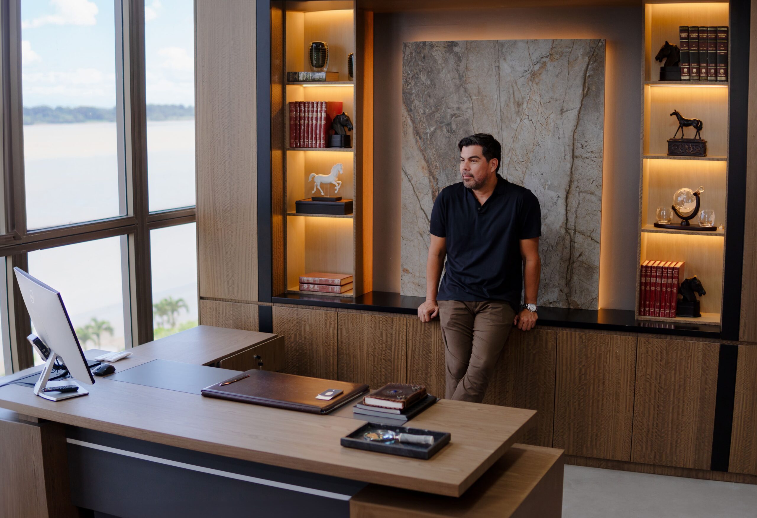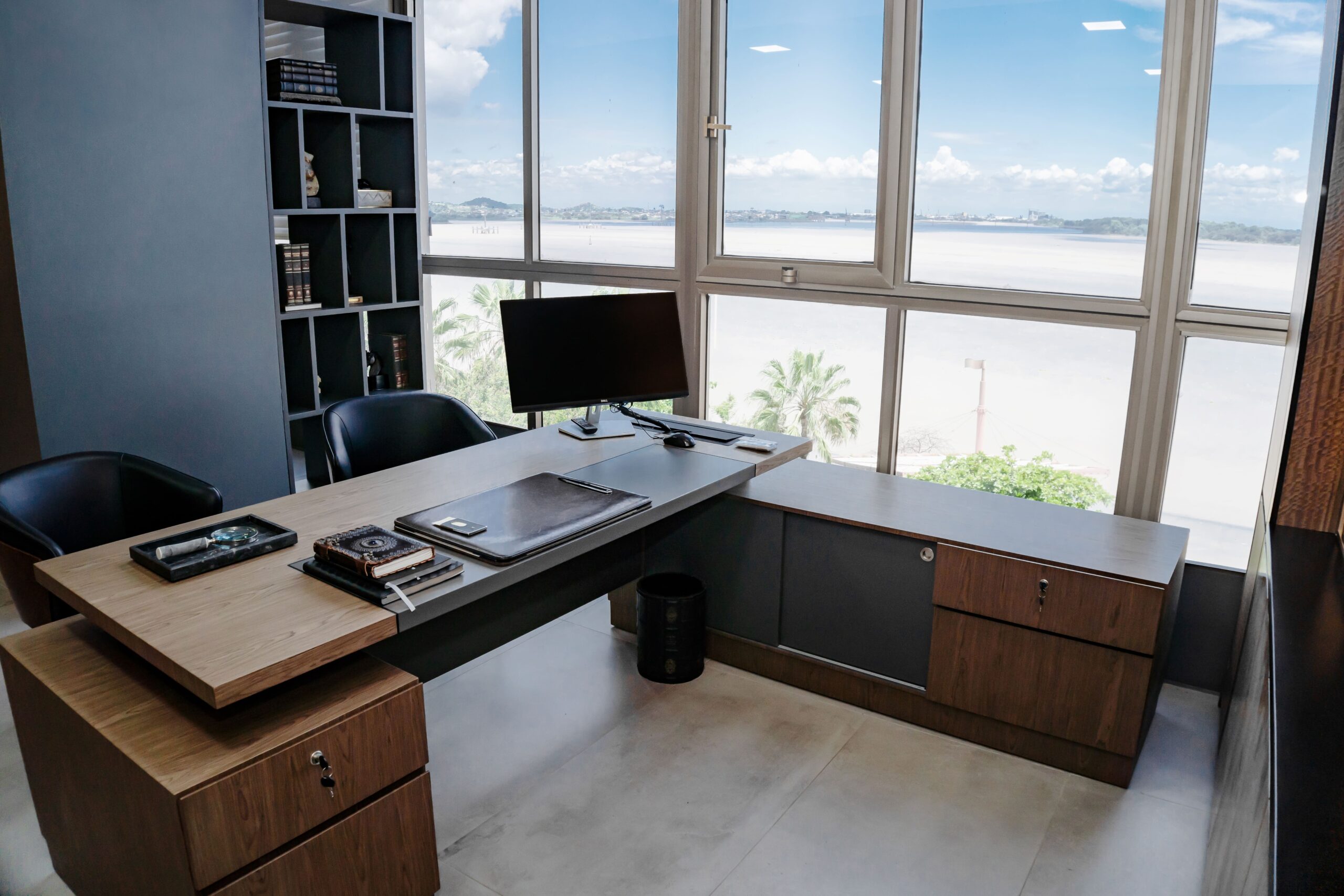 Gerencia con Visión: La oficina principal aprovecha al máximo la luz natural y la vista privilegiada al río. Integramos una estantería hecha a medida con iluminación LED indirecta y un escritorio ejecutivo en “L” que denota autoridad y modernidad.