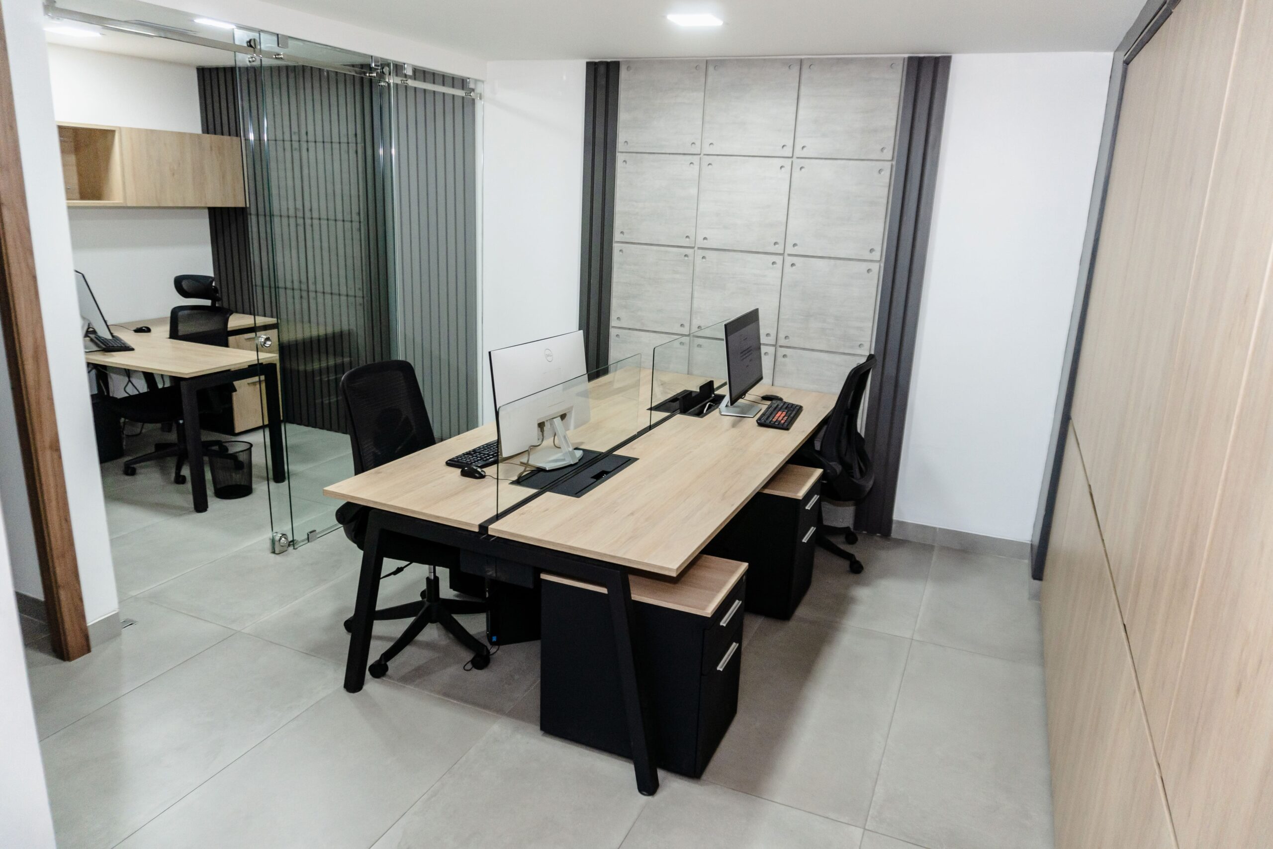 - Espacios Operativos Eficientes: Para el equipo de trabajo, optamos por un estilo más industrial y limpio, utilizando paredes con texturas de concreto aparente, divisiones de vidrio templado para mantener la amplitud visual y mobiliario ergonómico que fomenta la productividad.