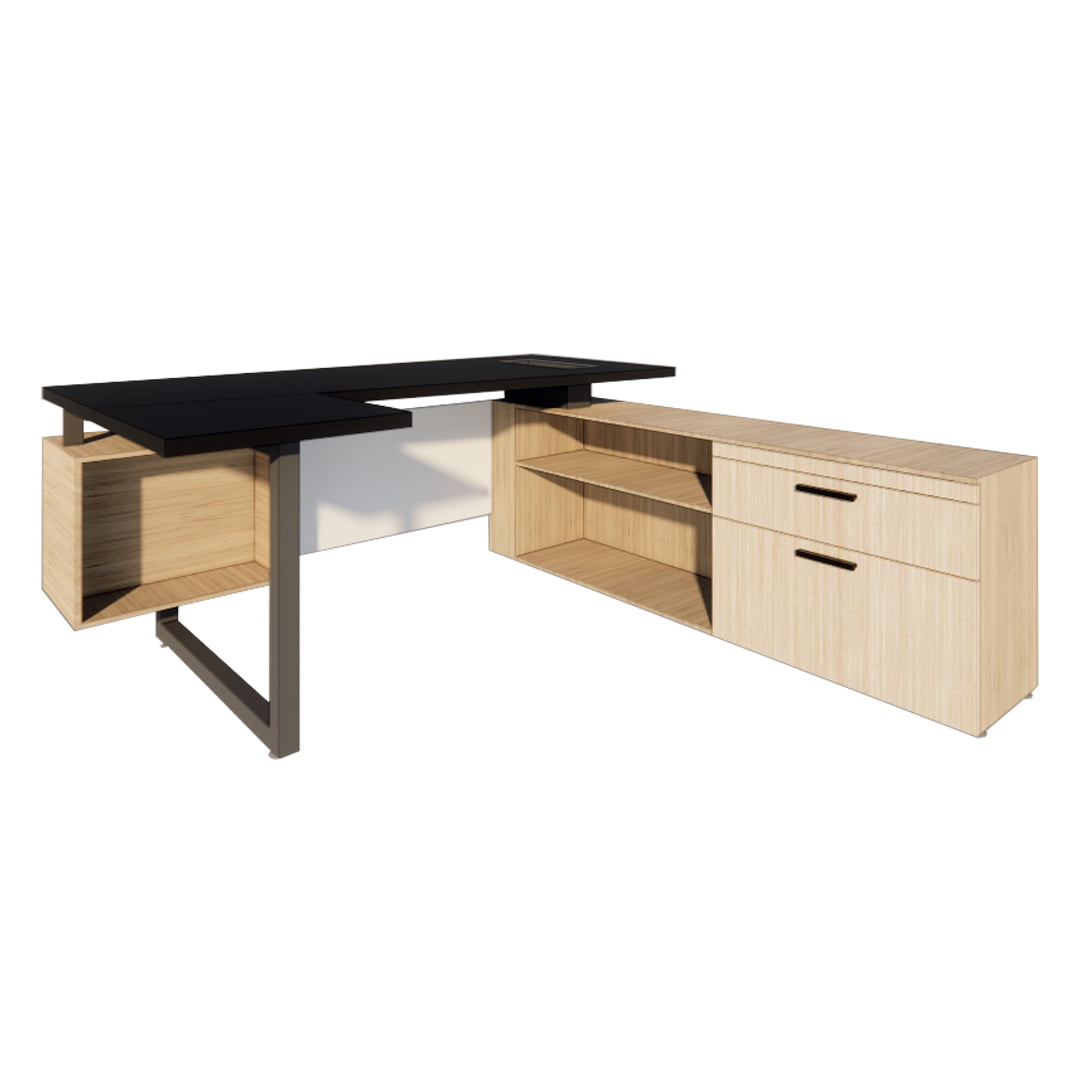 Escritorio Diagonal Delta en C con credenza Mixta de 2 gavetas y modulo abierto con puerta corrediza, repisa decorativa frontal